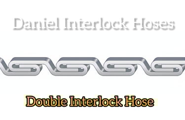 A double interlock metallic hose is built using interlocking metal strips formed into a flexible corrugated hose. It has two interlocking layers instead of one, which improves durability and prevents the hose from pulling apart under tension.