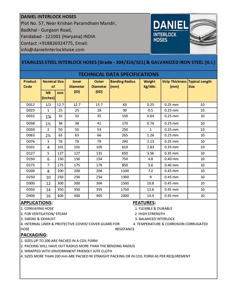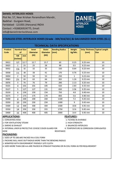 A Double Interlock Metallic Hose is a type of flexible metal conduit designed for applications that require strength, flexibility, and protection. It is commonly used in industrial, mechanical, automotive, and electrical systems to protect wires, convey gases, or handle low-pressure exhaust or ventilation.